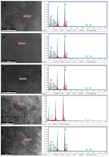 Descriptive statistics (arithmetic mean, maximum, minimum, standard deviation) were applied for the XPS and EDS data. Data presented normal distribution using the Shapiro-Wilk test. One-Way Analysis of Variance (ANOVA) was carried out to compare the groups, whilst Tamhane’s Post-Hoc Test was performed for the paired comparisons. SPSS 25.0 (IBM Corp., Armonk, NY, USA) package program was used for statistical analyses. The confidence interval was 95% (p < 0.05).