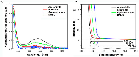 We fabricated a PMA thin film by spin-casting with different solvents, namely, acetonitrile, n-butanol, cyclohexanone, and DMSO, in a nitrogen glovebox with an annealing temperature of 180 °C. Figure 1a shows the normalized UV–visible–near-infrared (UV–Vis–NIR) absorption spectra of PMA thin films with different solvents; the main absorption peak occurs at a wavelength below 400 nm, and the broad absorption in the NIR region is attributed to the oxygen vacancy, which originates from the reduction of Mo(VI) [31]. Because the PMA film fabrication process was executed under an inert atmosphere, acetonitrile, which has no oxygen atom, exhibited the strongest absorption intensity in the NIR region.