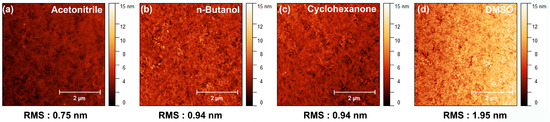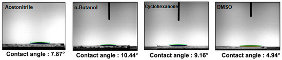 Figure 2 shows the contact angles of various solvents on the ITO substrate. The contact angle is an important factor in spin coating process. A small contact angle indicates better adhesiveness and wettability. If the contact angle is too large, the coating solution is spread without making a wet film. Therefore, a small contact angle is preferable for thin-film deposition. The contact angles of acetonitrile, n-butanol, cyclohexanone, and DMSO were measured to be 7.87°, 10.44°, 9.16°, and 4.94°, respectively. In terms of contact angle, DMSO appeared to be the most advantageous solvent. However, we need to consider other factors because contact angle does not solely factor into forming a high-quality thin film.