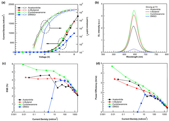 Figure 6b shows a representative electroluminescence spectrum of QD-EL devices at a driving voltage of 7 V. It confirms pure emission from the QD without any parasitic emission, indicating that electrons and holes are sufficiently confined within the QD layer. The maximum external quantum efficiencies (EQEmax) for the acetonitrile-, n-butanol-, cyclohexanone-, and DMSO-based devices were 4.59%, 4.19%, 5.92%, and 3.95%, respectively. The maximum power efficiency of the QD-EL device also showed a trend similar to EQEmax, with values of 3.35, 3.38, 4.69, and 1.77 lm/W, respectively. Because of the small work function of the PMA using DMSO, the Von of the device using DMSO had the highest value. Therefore, in terms of the current density, the turn-on current density was higher than the other devices. Table 2 summarizes the QD-EL device performance using various solvents of PMA.