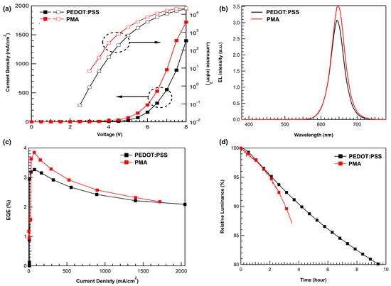 To compare the performance of PMA with the conventional HIL, PEDOT:PSS, we fabricated a device with the same structure except for HIL. As shown in Figure 7a, the PMA-based device had a much higher current density than the PEDOT:PSS-based device. Figure 7a reveals that PMA has better hole injection than PEDOT:PSS, which also improved luminance and resulted in better electrical properties. The electroluminescence spectra in Figure 7b show the same pure QD emission wavelength as shown in Figure 6b. The electroluminescence intensity is also stronger than that of the PEDOT:PSS-based device at the same voltage, as the luminance was enhanced because of the improved electrical characteristics of PMA. The maximum quantum efficiency and power efficiency of the PMA-based device were higher than those of the PEDOT:PSS-based device. Table 3 summarizes the QD-EL device performance comparing PEDOT:PSS and PMA using cyclohexanone. The slightly low performance of the device with PMA using cyclohexanone in Figure 7 compared to that in Figure 6 is due to the experimental deviation. Figure 7d shows the lifetime of the QD-EL device with PEODT:PSS and PMA. The QD-EL device with the PMA had a slightly shorter lifetime than the PEDOT: PSS device. This can be considered as the acidic properties of PMA still deteriorate the device’s stability.