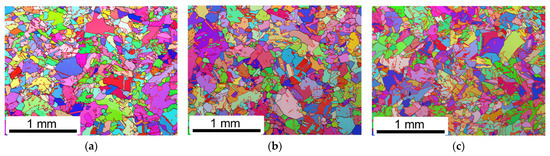 Figure 1 depicts the inverse pole figure (IPF) maps for HA-1080 °C, HA-1180 °C and HIP-DA samples. As shown, recrystallization and grain coarsening occurred when the heat treatment temperature was above 1080 °C. Irregular columnar grains produced during L-DED process were transformed into uneven, coarser and equiaxed grains. Furthermore, complex network of high angle grains boundaries formed due to the irregular columnar grains were also transited to the relatively regular grain boundaries (GBs). The grain size slightly increased with the increasing temperature of the heat treatment. The average area-weighted grain size evaluated from EBSD data for all various heat-treated L-DED samples was 318 ± 161 μm (HA-1080 °C), 397 ± 193 μm (HA-1180 °C), 350 ± 151 μm (HIP-DA), respectively.