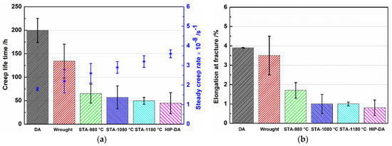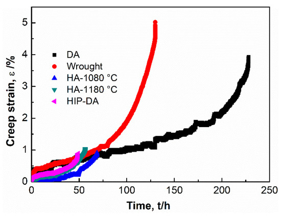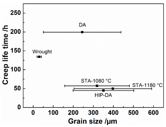 Increase in grain size may also contribute to worse creep performances for samples with recrystallized grains when compared to the DA sample. Figure 8 demonstrates the creep life of various investigated samples dependent on grain size. As shown, larger grains are not beneficial for the superior creep behavior in the current study. The majority of heat-treated L-DED specimens with significantly coarser grains achieved much worse creep life compared to the wrought specimen. Samples heat treated at temperature above 1080 °C showed a remarkable deterioration in creep life compared to the wrought variant, which can be attributed to the loss of L-DED-produced microstructural characteristics and the occurrence of grain coarsening. In the dislocation creep mechanism, fine grains are considered to contribute to better creep properties due to the grain boundaries strengthening mechanism by hindering the dislocation motion, which was supported by the study of Xu et al. [20]. Fine grains in the wrought sample show a good rotation ability and yield more deformation, confirmed by the evidence of cleavage planes decorated with extensive slip bands, as shown in Figure 5c. Furthermore, much finer equiaxed grains in the wrought sample help to slow down the crack propagation by altering the crack growth direction, as marked in white arrows in Figure 7f However, much coarser grains in recrystallized samples, HA-1080 °C, HA-1180 °C and HIP-DA with regular GBs shown in Figure 7c,d, may help cracks grow and result in worse creep properties. That may explain why, despite the absence of dislocation cell substructure and significantly undesirable δ phases at GBs in the wrought sample, the wrought sample nevertheless shows a superior creep performance to other recrystallized samples.