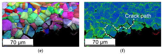 Figure 7 shows the representative IPF maps and KAM (Kernal Average Misorientation) maps in order to clarify the creep deformation mechanism. A significant plastic deformation was seen near the creep fracture surface of DA specimen in Figure 7a, which was indicated by a higher KAM shown in Figure 7b. However, the HIP-DA and wrought samples with the absence of a L-DED-produced microstructure showed little plastic deformation with a smaller KAM after the creep fracture, as shown in Figure 7d and Figure 7f, respectively. Moreover, local plastic deformation with a higher KAM near GBs in all tested samples clearly illustrated that cracks were initiated and propagated along the interface between the secondary phase particles (Laves, carbide and δ phases) and the GBs.