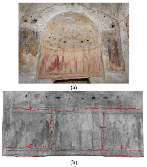 While these two paintings relate to the last phase of the building, the paintings in the apse are much older. The latter represent the subject of this study (Figure 1a). The extremely incomplete state of the painting makes it difficult to judge a stylistic and iconographic interpretation. To date, the proposal put forward by art historians, which identified the figures as male and female saints, has been replaced by the hypothesis according to which the iconographic theme represented would be the Ascension, contaminated by the theme of the Maiestas domini. In the apsidal basin the Virgin is represented in the center of the scene, beside the Twelve Apostles, while in the semidome Christ is depicted, seated on a throne, in the almond, no longer observable due to its poor state of conservation.