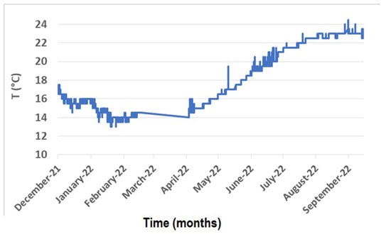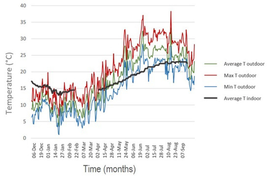 In the investigated period, the indoor temperature range has a minimum of 13 °C recorded in January and a maximum of 24 °C measured in September (Figure 5). More generally, we can state that the minimum temperature values are reached during January and February while the maximums are recorded during August and September.