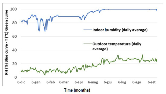 Monitoring was performed for a total of about nine months, from December 2021 to September 2022. Data were then processed to determinate the daily, monthly, and seasonal average, minimum, and maximum of both temperature and relative humidity. Furthermore, the parameters obtained were compared with the outdoor climatic data provided by ARPACAL (Agenzia Regionale per la Protezione dell’Ambiente della Calabria).