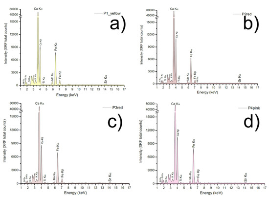 PXRF spectra acquired on the apse mural painting. P1, Yellow layer (a); P2, Red layer (b); P3, Red layer (c); P4, Pink layer (d).