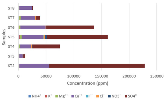 Sulfate ions could have several origins: they can come from the original materials or have different founts. In fact, they can be present as impurities in the plaster; however in the case of the apse mural painting of the Sotterra church, it is assumed that the calcium sulfate comes from the soil surrounding the building. Sulfate species are dissolved in soil water, and for capillary action may crystallize on the wall surfaces. In Figure 13, the ionic concentrations, excluding calcium and sulfates, have been reported.