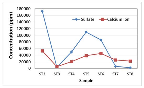 The strong correlation between the concentration of calcium ions and sulfate ions, expressed in Figure 12, corroborates the hypothesis of the presence of the gypsum phase.