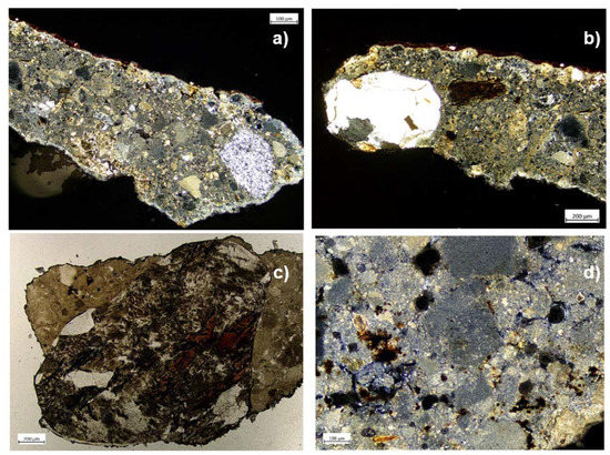 In particular, an aggregate characterization was conducted. All samples are characterized by a poorly sorted aggregate, in which it is possible to recognize monocrystalline and polycrystalline granules. Grains present a dimensional range from a few microns up to a millimeter, a roundness ranging from angular to rounded, and a sphericity from high to low. The aggregate consists almost entirely of carbonate rock fragments, while quartz crystals, biotite, quartzite grains, and oxides are more rarely found in the samples observed. It is possible to highlight primary and secondary porosities, such as microcracks, linked to degradation phenomena. In addition, interparticle and intraparticle porosities were observed. Sample ST1 presents a thin pictorial film on the surface of the plaster whose color appears reddish to brown under crossed Nicols (XN) and shows that the pigmented layer has not penetrated the plaster.