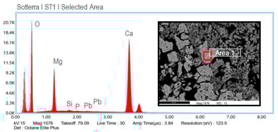 EDS spectra of the lump observed in the ST1 sample and related SEM image (to the right of the spectrum), highlighted in the red box as “Area 1”.