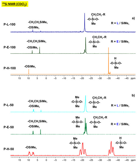 Liquid state 1H-, 13C- and 29Si-NMR spectra of the functionalized polysiloxanes were recorded in CDCl3 as a solvent on an Avance Neo 400 NMR spectrometer with tetramethylsilane (TMS, Billerica, MA, USA) as the reference.