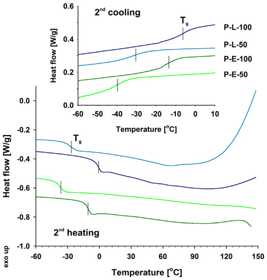 Phase transitions in the studied samples (native and functionalized polysiloxanes) were detected using a DSC 2500 (TA Instruments, New Castle, DE, USA). Thermograms were taken in N2 atmosphere at a rate of 10 °C/min for samples (sealed in aluminum pans) that were cooled from room temperature to −90 °C (5 min isotherm at −90 °C), then heated from −90 ° to 25 °C, cooled again to −90 °C (5 min isotherm at −90 °C) and finally heated to 150 °C. The cooling/heating cycle was repeated, and the temperatures of characteristic phase transitions were taken from the second measurement.