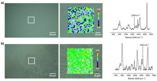 Raman signals (spectra and maps) were collected with an InVia Raman microscope (Renishaw plc, Gloucestershire UK). The polysilsesquioxane surfaces were analyzed using a 532-nm laser with 20× objective lens (Carl-Zeiss Jena, Germany), providing approximately 30 mW of laser power at the sample. Single spectra were collected with an exposure time of 7 s in the spectral collection range 600–1800 cm−1; 2D Raman maps were collected from 50 × 50 μm areas with 2 µm spatial resolution. The interpolation of spectral maps (for better illustration) and all operations on the data (baseline correction, normalization and intensity at point) were performed using the Wire 5.1 application.
