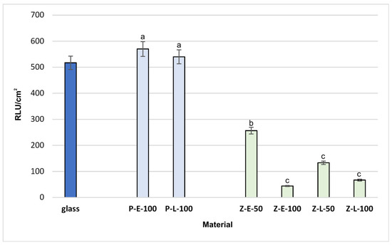 RLU scores for P-type surfaces after a 6-day incubation were high, indicating adherent organic matter rather than the presence of active bacterial cells. This can be assumed because microscopic images do not show numerous bacterial cells on these materials. On the other hand, photos of the control glass sample show that a high RLU value is obtained by bacterial cells arranged in clusters, the number of which is much greater than on P-type carriers. Different conclusions can be drawn by analyzing the results of two tests for Z-type surfaces. For these materials, both RLU values and microscopic images prove anti-adhesive and antimicrobial properties. The 6-day incubation time of the carriers was sufficient for the formation of biofilm in any possible form—clusters or continuous layers. Thus, the absence of such cellular structures after incubation period certainly proves the antibacterial activity of both types of materials (P-type and Z-type), and in the case of Z-type carriers, anti-adhesive properties as well.
