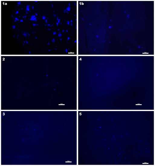 The amount of cell inoculum (0.1 mL) was standardized densitometrically (1°McF) using a DEN-1B densitometer (Merck KGaA, Darmstadt, Germany). The bacterial cultures and carriers were incubated at 25 °C with agitation on a laboratory shaker (Unimax 1010 Platform Shaker) at 135 rpm for 6 days. Cell adhesion to the carriers was evaluated using both fluorescence microscopy and luminometry using ATP-free sampling pens and a HY-LiTE2 luminometer (Merck KGaA, Darmstadt, Germany). The luminometric measurements were expressed in RLU/cm2 [56]. Adhered bacterial cells were also observed after DAPI staining and using a fluorescence microscope NICON BX41 fitted with a 50× lens and with top illumination of the tested surfaces by an external lamp. Images were captured with a digital camera.