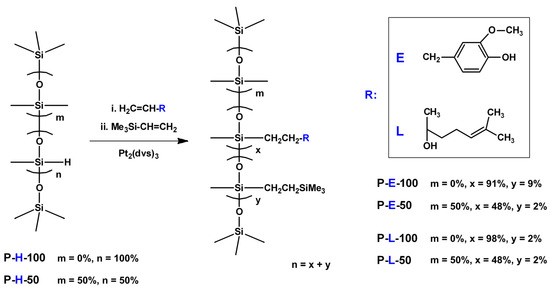 In this report, we present results of comparative studies on polysiloxane (Scheme 1) and polysilsesquioxane-based materials (Scheme 2) grafted with eugenol (E) or linalool (L) residues. They were prepared by hydrosilylation of polyhydrosiloxane and triethoxysilane precursors. The products obtained with HSi(OEt)3 were subsequently converted to oligosilsesquioxanes in a sol–gel process.