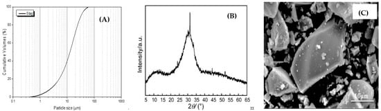 Physicochemical properties of slags: (A) particle size distribution, (B) XRD pattern, and (C) SEM picture.