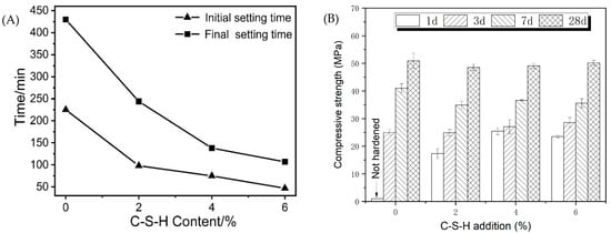Figure 3A shows the setting times of the sodium carbonate-activated slag binder with different dosages of C-S-H seeds. The reference sample shows long initial and final setting times of 225 min and 430 min, respectively. It is worth noting that the setting times of reference are shorter in comparison with previous research studies, whose hardening process of the carbonate-activated binders often takes around 3–7 d [5,11]. This is probably due to a false set, as indicated by the 1d-compressive strength of the reference sample. The setting times of samples are significantly shortened after dosing C-S-H seeds. The initial and final setting time of the slurry with 2% of C-S-H seeds reduce to 98 min and 244 min, respectively. Further increasing the dosage of C-S-H seeds results in a short setting time, and the initial and final setting time respectively decreased to 48 min and 118 min, proving that C-S-H seeds are an efficient agent in controlling early age hydration and the hardening process of SCAS binders.