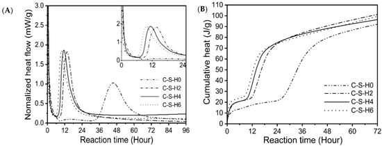 Figure 4A shows the isothermal calorimetric curve of samples with different C-S-H seeds. Similar to cement, the hydration of carbonate activation can be classified into five stages, i.e., preinduction, dormant, acceleration, deceleration, and steady stages. A long-dormant period of approximately 30 h for the reference sample was observed, which is in line with previous findings that the hardening process of SCAS may be long (depending on the chemistry and size of slag particles) [11,29]. The preinduction period of the hydration mainly occurs within 6 h of reaction, and the duration of the dormant period of the reaction is significantly shortened by adding C-S-H seeds. In comparison with the reference, the time to reach the exothermic peak of the specimen with 2%, 4%, and 6% of C-S-H seeds reduces to 13.5 h, 10.9 h, and 9.2 h, indicating that the precipitation of the main hydration products and the hardening process of the SCAS occurs earlier.