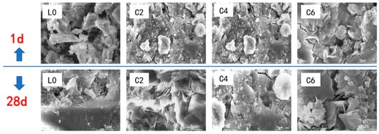 Figure 5 shows the SEM images of carbonate-activated slag with different dosages of C-S-H seeds after 1 d and 28 d of hydration. A loose structure with anhydrous slag particles is noticed for the reference sample after 1 d of curing, which is in agreement with the results that it does not gain strength after 1 d of reaction. The formation of the C-A-S-H gel is observed for the samples with C-S-H seeds cured for 1 d, and a relatively dense microstructure is found. Meanwhile, the flaky hydrotalcite and cubic calcite are also observed to be mixed with C-A-S-H gel, indicating the promoted early age hydration of the SCAS. With the increasing dosage of C-S-H seeds, the interior of the sample is filled with dense hydration products. After 28 d of hydration, the pores at the interface of the C-A-S-H gel and slag particle are filled with hydration products, and a denser structure is noticed for the reference sample and samples with C-S-H seeds.
