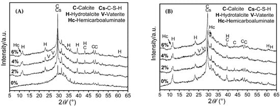 Phase characterization of samples with C-S-H seeds at different curing ages: (A) 1 d and (B) 28 d.
