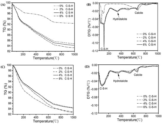 To further understand the role of the C-S-H seeds on the hydration products of SCAS, thermogravimetric analysis is performed to quantify the mass proportion (Figure 7). Generally, the decomposition peaks between 0 °C and 160 °C are attributed to the release of free water and the dehydration of C-A-S-H gel. The incorporation of C-S-H seeds promotes the nucleation and growth of calcium silicate hydrates, and the formed C-A-S-H gel loses bound water in the temperature range of 0 °C to 160 °C, as confirmed by the corresponding decomposition peak in the DTG (Figure 7B). The decomposition peak in the temperature range of 160 °C to 530 °C and 620 °C to 730 °C is attributed to the thermal decomposition of hydrotalcite and calcite, respectively.