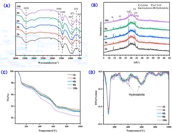 Accelerated hydration is observed for samples with C-S-H seeds. To further understand the role of C-S-H seeds on the early age hydration of carbonate activation, the hydration is divided into different stages based on reaction kinetics (Figure 4A), and the hydration products of samples with 4% of C-S-H seeds are characterized in terms of phase analysis, TG-DTG, and FT-IR every two hours (Figure 8). As can be seen, the incorporation of C-S-H seeds promotes the precipitation of carbonate-containing phases, especially at the first 2 h of reaction. Infrared spectroscopy also shows that the formation of C-S-H is promoted, as indicated by the vibration of bands at around 947 cm−1. It is noticed that the formation of the carbonate-containing phases (e.g., calcite, gaylussite, and hydrotalcite) occurs at the beginning of hydration, whose precipitation also helps the pH development of pore solution and dissolution of slag particles.