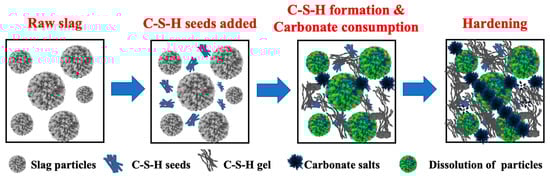 Based on the obtained results, the role of the C-S-H seeds on the early age reaction of carbonate-activated binders is proposed (Figure 9). The dissolution of slag particles begins at the time when it mixes with the activator (Na2CO3), and soon the precipitation of calcium carbonate occurs. The consumption of CO32− anions raises the pH value of the pore solution that allows the ionic release of Si, Al, and Mg from the glassy phase of slags, increasing the ionic strength of the pore solution. According to the theory of classical nucleation, the acceleration mechanism of the C-S-H seed on the early age reaction of carbonate-activated binders is that the precipitate preferentially grows on the added C-S-H seeds. The nucleation of new phases overcomes less free energy due to the introduction of the nucleus, and the free energy ΔG is positively associated with the saturation level of the pore solution. In comparison with other seeds, the C-S-H seed shares a similar chemical structure to the C-A-S-H gel, the main strength-giving phase of the carbonate-activated binders, which facilities the formation of the C-A-S-H gel and carbonate-containing phases at the early reaction stages and promotes the hardening process.