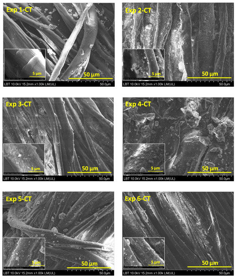 SEM analysis can provide information on the morphology of cotton and leather surfaces and the differences among samples before and after treatment. SEM images (Figure 1) showed the typical longitudinal stripes of cotton fibers (with a diameter in the range of 3–15 μm). A lower quantity of particles was deposited on the Exp 1-CT surface compared with those of Exp 2-CT…Exp 6-CT. Comparing Exp 1-CT with Exp 2-CT, a better anchoring of particles was observed for Exp 2-CT. The only difference between the two samples is the presence of reduced graphene oxide in the coating formulation for Exp 2-CT. Thus, it can be assumed that the residual hydroxyl groups of GR create hydrogen bonding with those of TiO2-SiO2 particles and also with the generated polar groups by plasma treatment of cotton surface, playing a positive role for anchoring particles. SEM images of Exp 4-CT and Exp 5-CT revealed some larger agglomeration of particles in the gum rosin/alginate complex matrix, while less agglomeration of particles can be seen in the case of Exp 3-CT and Exp 6-CT. The changes in morphology of Exp 1-CT…Exp 6-CT as a result of CAPP exposure are more difficult to quantify by SEM analysis due to the limited penetration of generated active species on cotton surface (in the range of few nanometers until about 200 nm) [12,34] and also by presence of surface organic additives.