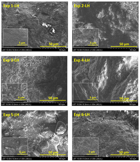 Leather surfaces (Exp 1-LH…Exp 6-LH) showed similar aspects (Figure 2). The organic dispersion media covered all leather surfaces. The most agglomerations of particles can be observed on Exp 1-LH, Exp 4-LH and Exp 5-LH surfaces, suggesting that these particles are not uniformly distributed at the nanometric level. No obvious plasma effect on leather surfaces was observed. However, according with earlier research described [35,36], plasma treatment causes an etching effect on the leather surface related to the modification of leather micro-pores providing better penetration or adhesion of the coating formulations; thus, the micro-pores could be partially or totally covered [30,37].
