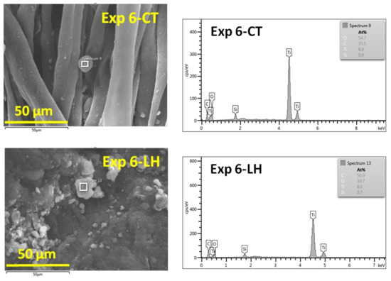 The EDX spectra of the selected Exp 6-CT and Exp 6-LH (Figure 3) showed the presence of C, O, Si and Ti. The amount of Ti and Si measured by EDX presents a relative value due to the roughness of the surfaces, which makes it difficult to calculate exactly the content of elements.