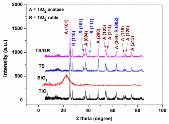 The XRD spectra of pure TiO2, SiO2, TiO2-SiO2 and TiO2-SiO2/reduced graphene oxide are presented in Figure 6. The diffraction pattern of pure SiO2 powder revealed a low-intensity broad peak located at 2θ = 22°, indicating the amorphous state of pure SiO2 powder, in agreement with the previous findings [38,39]. Meanwhile, the XRD spectra of the TS and TS/GR composites showed a similar profile to the pure TiO2, indicating the presence of the anatase (PDF 01-078-2486) and rutile (PDF 01-078-2485) crystalline phases of TiO2. No contribution of SiO2 is observed in the diffraction pattern of TS and TS/GR composites.
