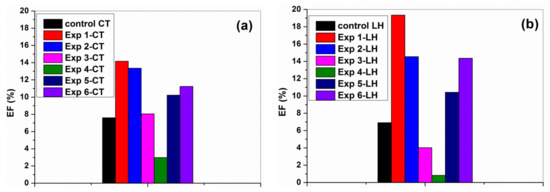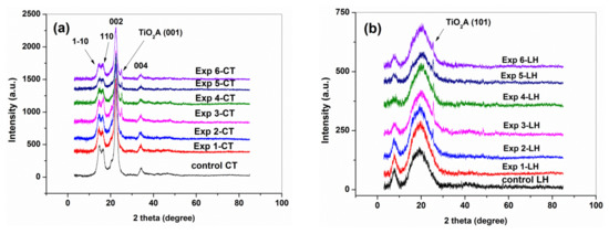 The XRD pattern of Exp 1-CT…Exp 6-CT (Figure 7a) and Exp 1-LH…Exp 6-LH (Figure 7b) indicated that the structural integrities of cellulose and collagen were retained.