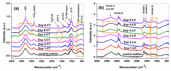 In agreement with previous studies [41,52,53], the Exp 1-CT…Exp 6-CT samples (Figure 8a) showed the characteristics absorption bands of cellulose: between 3000 and 3600 cm−1 (intra- and inter-molecular hydrogen bonding), at 2900 cm−1 (−CH2 asymmetric stretching of long alkyl chain), at 1628 cm−1 (adsorbed H2O), at 1429 cm−1 (−CH wagging, in-plane bending), at 1311 cm−1 (−CH wagging), at 1160 and 1106 cm−1 (asymmetric bridge C–O–C), 1053 cm−1 (C–OH asymmetric in-plane ring stretching of C3–OH), at 1029 cm−1 (C–O stretching of C6–OH), at 999 cm−1 (C–O stretching), at 895 cm−1 (C1–O–C4 asymmetric out-of-phase ring stretching; β glycosidic bond) and at 600 cm−1 (O–H out-of-plane bending). Although the spectra of Exp 1-CT…Exp 6-CT are quite similar to that of the control cotton sample, some changes could be observed, i.e., a slight band broadening in the range of 3000–3600 cm−1 (suggesting the contribution of inter-molecular hydrogen bonded −OH group from alginate structure) for all samples [54], a small increasing of band intensity at 1628 cm−1 (associated to the amount of bound water) for Exp 4-CT and Exp 5-CT and a widening of the band at 600 cm−1 (by contribution of symmetric stretching vibration of O–Ti–O groups) for all leather samples [29]. No typical absorption bands corresponding to stretching (at ~800 cm−1) and bending (~1000 cm−1) vibration modes of the Si–O–Si bonds were found due to overlapping on the fingerprint of the carbohydrate (C–O stretching) region (1160–895 cm−1) from cellulose. The ATR-FTIR spectra do not reveal peak shifting or new peaks, different from the control sample spectrum, indicating that no chemical interactions between cellulose and coating formulations occur during the applied treatments.
