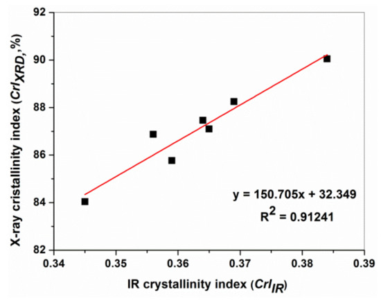 After the normalization of XRD spectra (not shown here), the Segal’s equation [42], Equation (2), was used to determine the percentage of crystalline cellulose or the X-ray crystallinity index (CrIXRD) of all cotton samples: