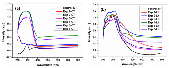 UV–Vis spectra of (a) Exp 1–CT…Exp 6–CT and (b) Exp 1–LH…Exp 6–LH in comparison with those of control cotton (CT) and leather (LH) samples.