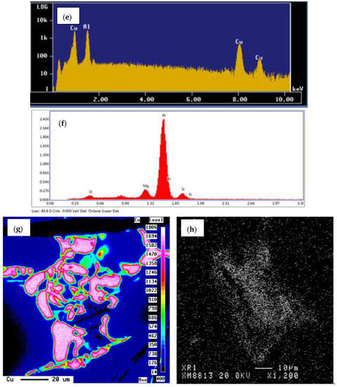 Backscattered electron images of the three base alloys in the as-received condition: (a) alloy A; (b) alloy D; (c) alloy D high magnification; (d) alloy E; (e,f) EDS spectra corresponding to Al2Cu and Mg2Si, respectively; (g,h) X-ray images of Cu and Mg distribution in (c) and (d), respectively.