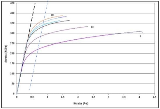 Stress-strain diagrams obtained from alloy B at room temperature following different heat treatment conditions. The broken blue line indicates 0.2% proof strain. The colors of the curves correspond to the heat treatment conditions as listed in Table 3 – of interest to note are the curves for treatments 10, 13 and 9.