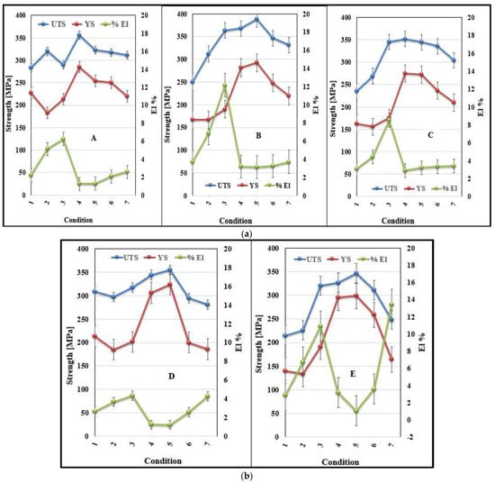 The five alloys achieved peak strength when T6 heat treatments were used (i.e., treatments 10 and 11) as the precipitates were fine, coherent, and displayed small inter-particle spacing so that the strength significantly increased. From Figure 10, it may be seen that alloys A, B, and C reached their peak strength with the heat treatment condition 11 as also presented in Table 5. When these tensile results are compared with those of the as-cast condition of each alloy, significant improvement in strength is noted.