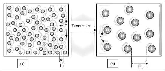 Schematic representation showing the influence of increasing the aging temperature on the size, density, and inter-particle spacing of the hardening precipitates: (a) at a low aging temperature and (b) at a high aging temperature. (L1 and L2 indicate the inter-particle spacing in each case.). The black arrows represent the dislocations motion through the precipitates.