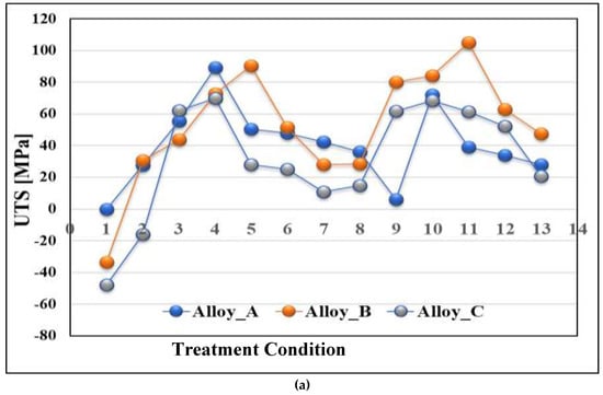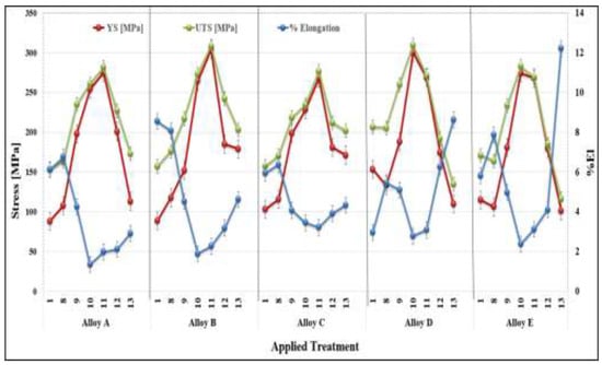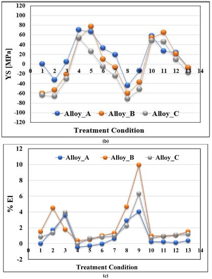 - In this case, also, treatment 8 contributed negatively to the YS (40–60 MPa) with alloy C exhibiting the minimum YS of the three alloys.