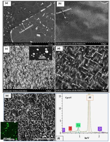 Figure 2 illustrates the microstructure of the as-received alloys revealing the different phases and their relative volume fractions. It is evident that, due to the high copper content in alloy A, the number of precipitated phases (mostly Al2Cu) is markedly higher than those in alloy D associated with small particles of the Q-phase. Since alloy E contains only Si and Mg, Mg2Si is the main precipitated phase, as shown in Figure 2d, along with fine β-Al5FeSi platelets and π-FeMg3Si6Al8. Figure 3 reveals the precipitation of Al3Zr within the aluminum grains, whereas Ag was segregated towards the grain boundaries in alloy C. According to the Al-Zr binary diagram shown in Figure 3e [16], the liquidus point of 0.3% Zr is approximately 750 °C. The melting temperature was 830 °C, sufficient to dissolve most of the added Zr. During the period of reducing the melt temperature to 750 °C prior to casting, some of the Al3Zr might have precipitated in the form shown in Figure 3a.