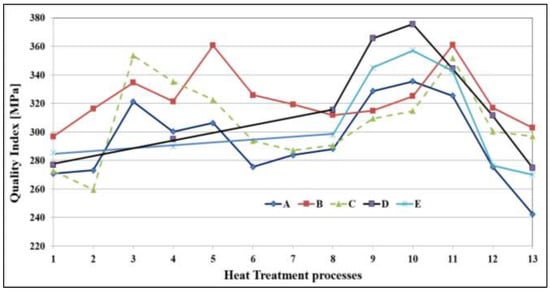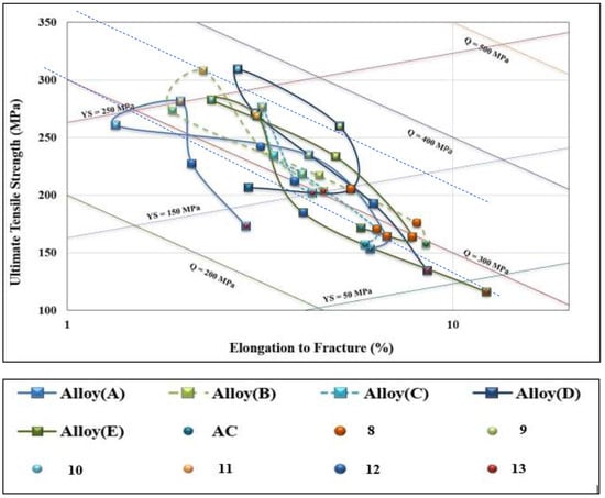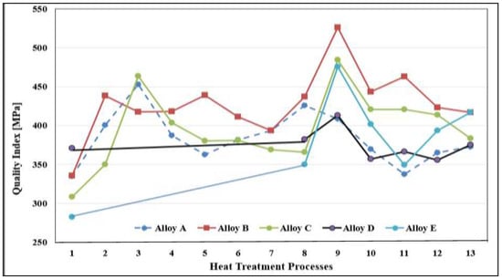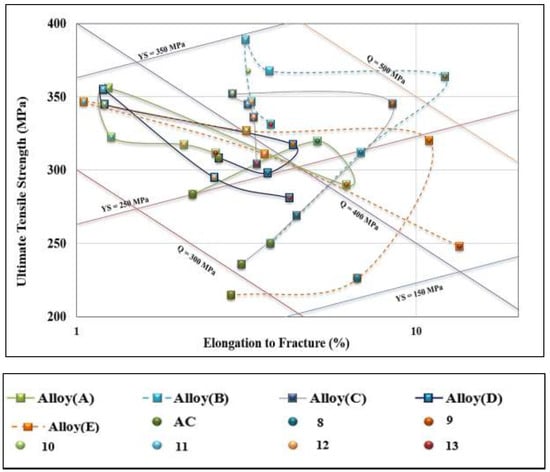 Figure 13 presents a panel chart showing the Q-values corresponding to alloys A, B, C, D, and E for the 13 applied heat treatments including the as-cast condition. In the solution heat treatment condition (treatment #3), alloy C revealed the highest Q value above the commercial alloys. However, in the T6 temper, alloys C and E obtained very close values. In all, alloy B offered the highest Q levels over the whole heat treatment duration.