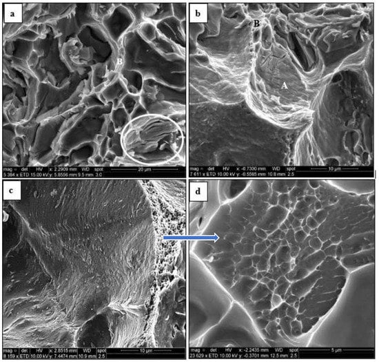 Figure 17 illustrates the variation in the fracture details of alloy B as a function of heat treatment when the tensile bars were tested at 250 °C. The fracture surface depicted in Figure 16a mainly revealed a dimple structure compared to that presented in Figure 17a for the same heat treatment but tested at 25 °C. Occasionally, some signs of brittle fracture similar to those marked by the circled area in Figure 17a were observed. Samples treated in the T7 condition with prolonged aging time (250 °C for 100 h) prior to pulling to fracture revealed two distinct areas marked A and B as shown in Figure 17b. Detail of the area marked A is shown in Figure 17c revealing a long series of slip lines covering the entire surface of the deformed dimple. Apparently, the gaps between two adjacent dimples—see the area marked B in Figure 17a—are composed of an ultra-fine dimple network (approximately 600 nm).