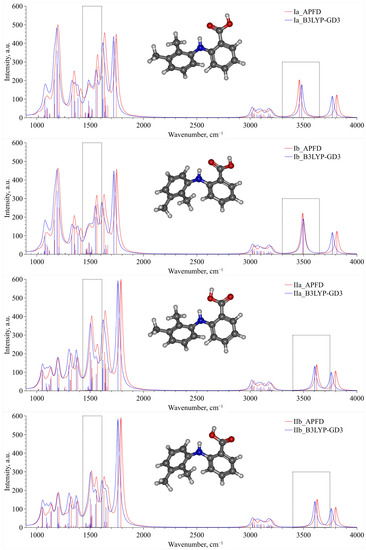For two groups of conformers—Ia, Ib and IIa, IIb—we calculated a set of IR vibration frequencies, presented in Figure 5, within QCC using B3LYP–GD3 and APFD functionals. The presented spectra for each conformer, which were calculated using these two functionals, are in good qualitative agreement and can be used to analyze the experimental IR spectra. For convenience of presentation, each vibration frequency was described by a Lorentzian profile with the same dispersion. An analysis of this set of spectra allowed us to select two spectral domains lying in the wavenumber ranges of 1430–1610 cm−1 and 3300–3750 cm−1. These domains are bounded by dashed-line rectangles in Figure 5 and can be chosen as analytical ones when analyzing the experimental IR spectra. In the first domain (1430–1610 cm–1), the high-frequency contribution is associated only with the N–H group rocking vibration, whereas the low-frequency one contains several vibrational bands that are mainly related to the complex vibrations of the MA molecule aromatic system. The second wavenumber range (3300–3750 cm−1) contains only one spectral contribution related to the stretching vibration of the N–H functional group of the MA molecule.