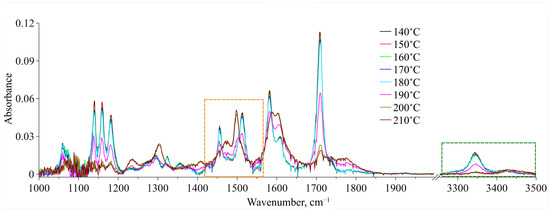 Relying on the quantum chemical calculations and MD simulation results, we chose two spectral domains, which will be analyzed below. These areas are bounded by dashed-line rectangles in Figure 8. A qualitative analysis of the spectral changes in the wavenumber range of 3250–3500 cm−1, which is related to the N–H stretching vibrations, showed that in the temperature interval of 140–190 °C, there are two spectral contributions centered at 3344 cm−1 and 3430 cm−1. According to our QCC, the first one, which is dominant, can be assigned to MA Conf. I. Consequently, the second one, which has much lower intensity, can be assigned to MA Conf. II. Then, starting from 190 °C the intensity of the low-frequency component considerably decreases. Along with this, the intensity of the high-frequency component becomes higher. Finally, in the temperature range of 200–210 °C it becomes dominant. However, because the MA concentration in the CO2 phase is low and, consequently, the intensities of these two spectral contributions (as well as the signal-to-noise ratio) over the whole temperature range are low too, it is not rational to use this spectral domain for the quantitative analysis of the conformational equilibrium. Nevertheless, the general trend of the spectral changes is in good agreement with that of the changes in the spectral domain related to the C=O stretching vibrations (see above), as well as with the results of our previous work, where we studied the conformational equilibrium of MA molecules in the scCO2 phase contacting with solid MA.