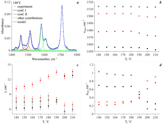 (a) An example of the experimental spectrum deconvolution for the temperature of 140 °C. Temperature dependences of: (b) the maximum positions of the spectral profiles (νmax); (c) dispersions of the spectral profiles (γ); (d) integral intensities of the spectral profiles (Aint). Hereinafter the black circles correspond to MA Conf. I and the red circles denote MA Conf. II; the solid circles correspond to the spectral bands, which are attributed to the complex vibrations of the aromatic system and the open circles denote the spectral bands assigned to the N–H group rocking vibrations.