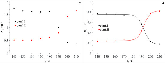 (a) Temperature dependencies of the integral intensity values summed pairwise (A′) for the spectral profiles that correspond to Conf. I and Conf. II (see Figure 9); (b) Temperature dependences of the mole fractions (X) of these conformers calculated as .
